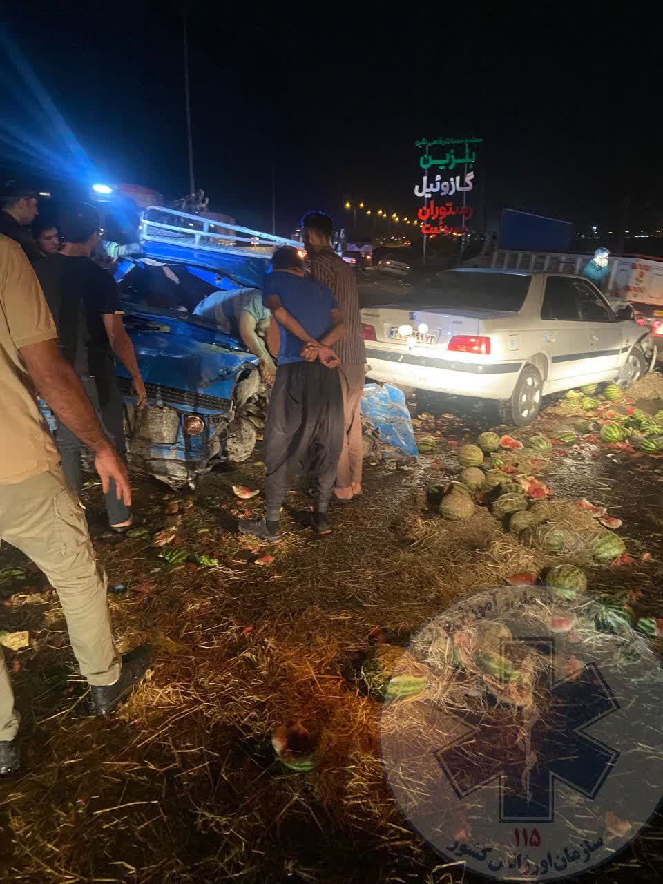 این تصادف 100 متر قبل از پمپ بنزین نگین جنوب بود که کد آمبولانس علویه و قطب آباد به محل اعزام شدند